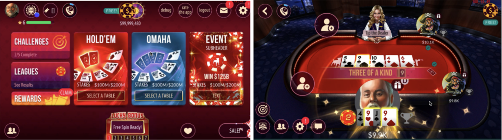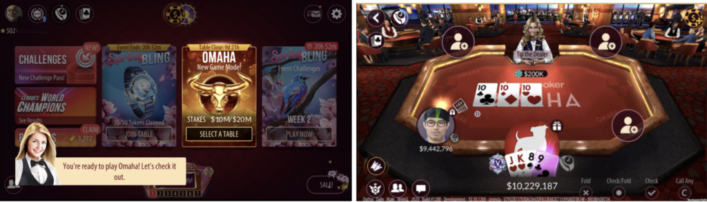 Pictured below is the prototype that was presented to the judges in Zynga’s 2020 hackathon, followed by images from “Omaha” as it exists in Zynga Poker today.