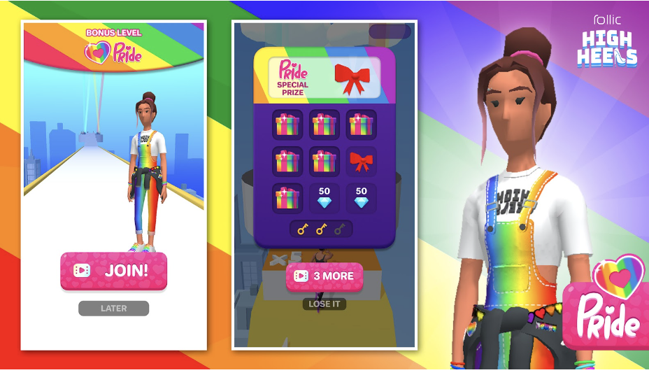 Throughout the month of June, Rollic invites High Heels! players to #PlayWithPride as they strut down the festive runway with brand new characters, new themed accessories and an exclusive Pride heel design! The special in-game event also includes limited-time gift boxes to collect, a new friendly pet to adopt and an exclusive new bonus level full of Pride.